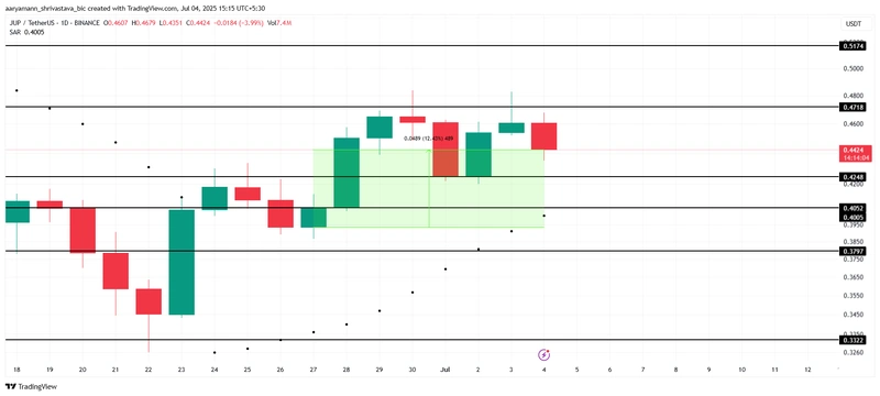 If JUP breaks through the $0.471 resistance, it could target $0.517. However, without sustained buying momentum, the altcoin might continue to consolidate, limiting short-term gains.