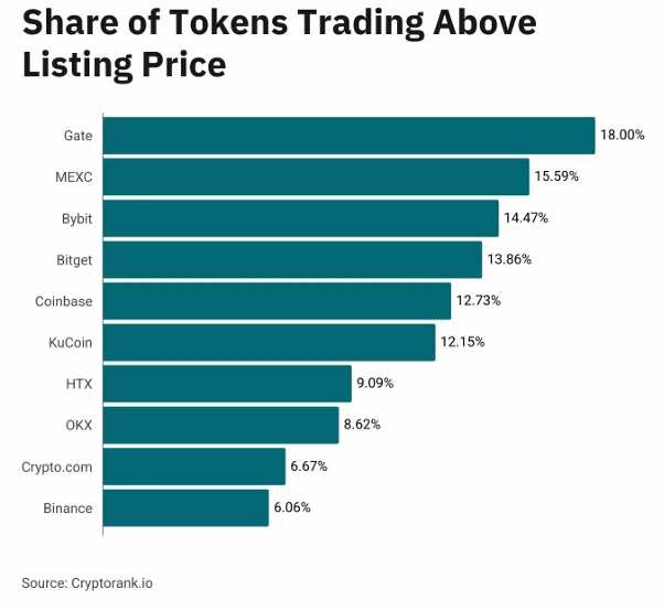 Gate recorded the highest share of tokens trading above their listing price at approximately 18 percent. MEXC and Bybit followed, each posting positive rates below 16 percent. At the lower end, Binance recorded the weakest relative performance, with roughly 6 percent of tokens trading above their listing price.
