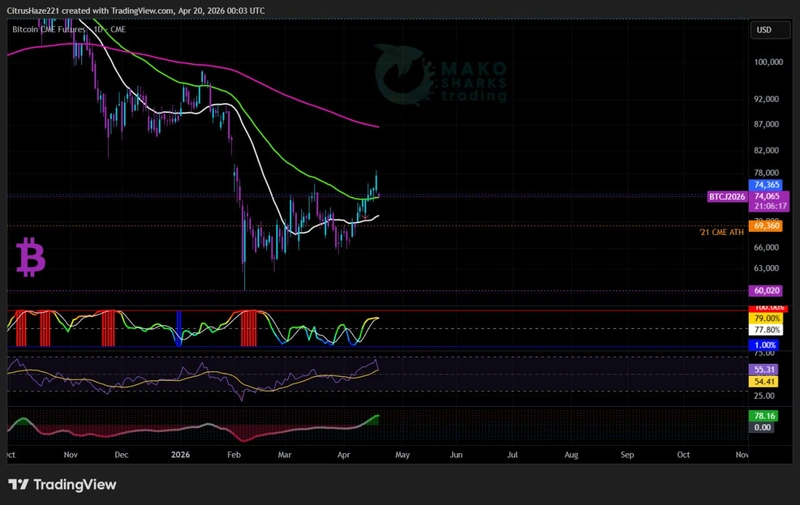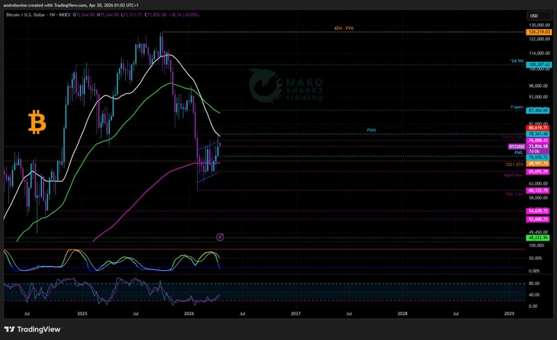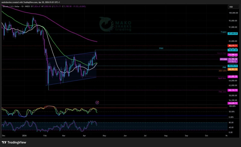 Bitcoin kicks off its week at 73.8k! Bulls had a strong week behind them, but the real test is now ahead. The latest expansion pushed price straight into the weekly 21SMA, which acted as resistance and kept BTC within the bear flag structure. The Orange man continues to play a major role with his TACO “negotiations,” to which the market remains highly sensitive. Price is currently trading within the 60k–80k range, but multiple factors are still leaning in favor of the Bears. Can Bulls reclaim key levels and push for expansion above 80k, or will Bears once again capitalize on the geopolitical noise? 🕊 😠 🔫
