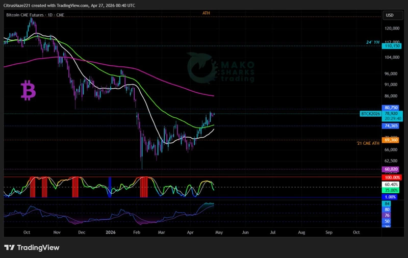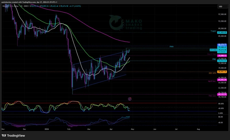 Bears’ coffee break is coming to an end. The broader context remains tilted in their favor, and this green April can still end up as a trap, setting up the classic sell in May and walk away scenario. Ideally for Bears, BTC needs to stay below 80k and secure any clean daily close below PWL 73.7k, which would likely drive price back toward the weekly 200EMA at 68.7k and put the 70k zone under pressure. ☺️ ☕️ 🛠