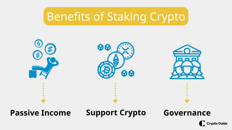• Passive income: One of the main benefits of staking crypto is a passive income stream, meaning you can earn money without actively trading or managing your investments.