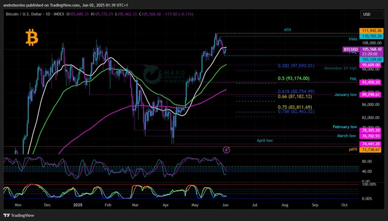 It's worth noting that Bulls would prefer to see a milder pullback early in the month rather than later, in order to potentially close June in the green. As long as Bitcoin trades above the April low at 74.4k, it's still within Higher Low territory and can “afford” a deeper pullback. Ideally, Bitcoin & Bulls defends the 100k zone and seeks support in the upper 90k region and the daily 55EMA 99.8k, from where it could potentially trigger a positive reaction and continuation of the broader trend. 🌈 ⬆️ 🚀