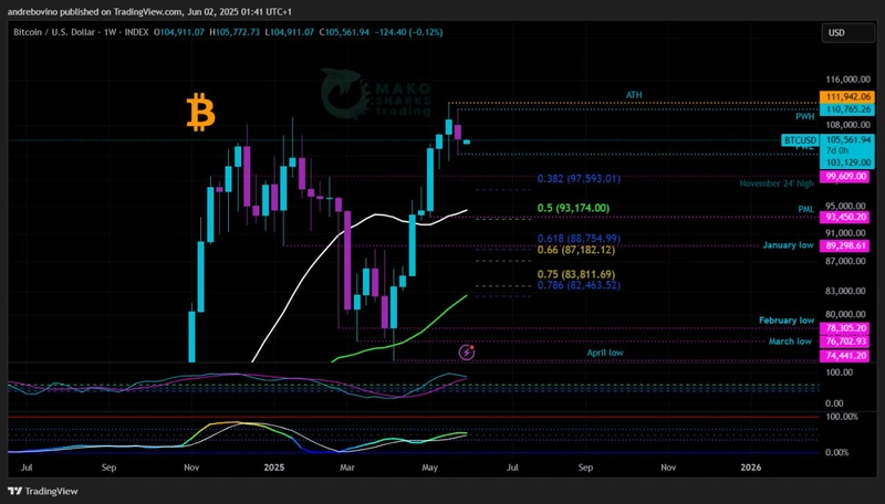 Bulls are in a slightly less favorable position short term. To regain Bullish momentum, Bitcoin needs to reclaim daily 21SMA 106.3k and seek for expansion towards PWH 110.7k where is crucial to secure any daily close during the week above it or ideally above ATH 111.9k which would push Bitcoin back into uncharted territory!