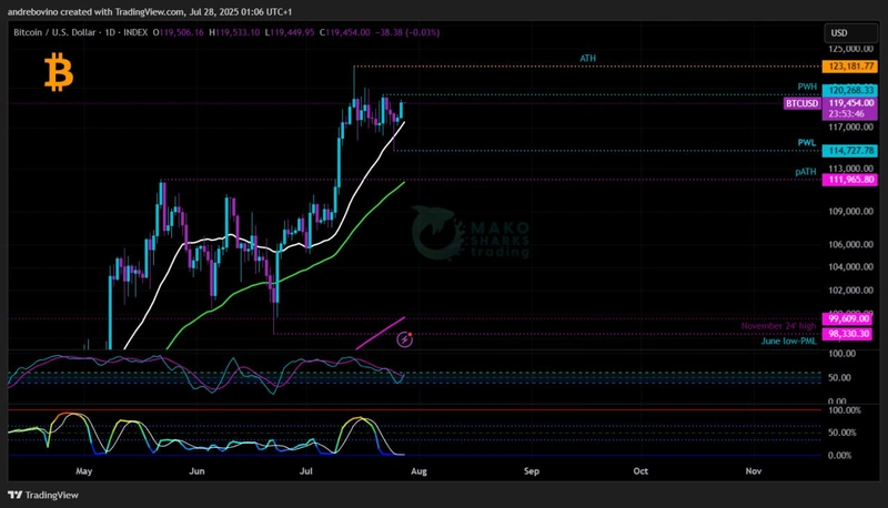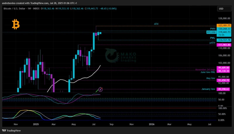 Bitcoin kick’s off its new week at 119.4k! Since printing the ATH at 123.1k for the last 2 weeks Bitcoin has been moving in a tight 5/6k range and after a mild drop, found a positive reaction at the daily 21SMA. This week it's looking for a potential breakout and a new All Time High!