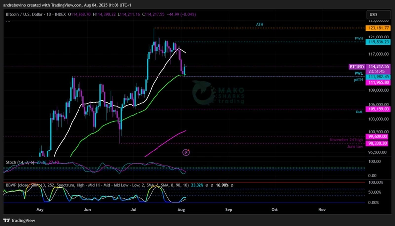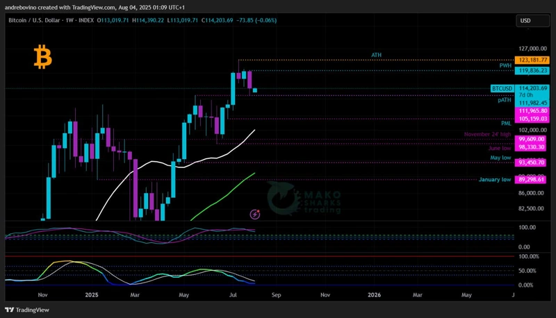 Bitcoin kicks off its week at 114.2k after last week's slide to the 111k support zone. Historically, August hasn't been Bitcoin’s favorite month and with half the planet on vacation mode, maybe price action is too. Ferragosto is here, let the charts nap while you tan. 🏖 🏝 😴