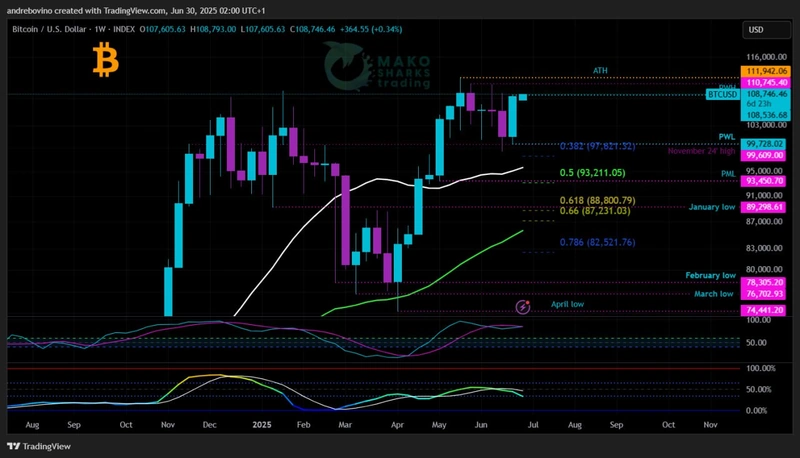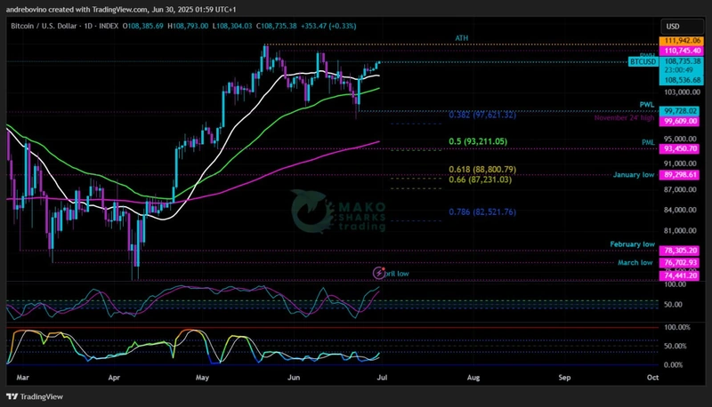 Bitcoin kicks off its new week at 108.3k, right at the edge of glory or the brink of another dip depending on who you ask. Bulls see flags, Bears see traps, but it might all just turn into another classic summer sideways saga. With a packed macro calendar ahead and Trump stirring talk of new tariffs on Canada, market moves could be cautious early on, especially with the U.S. Independence Day holiday on Friday likely to drain momentum quickly. 🐂 🏖 🐻
