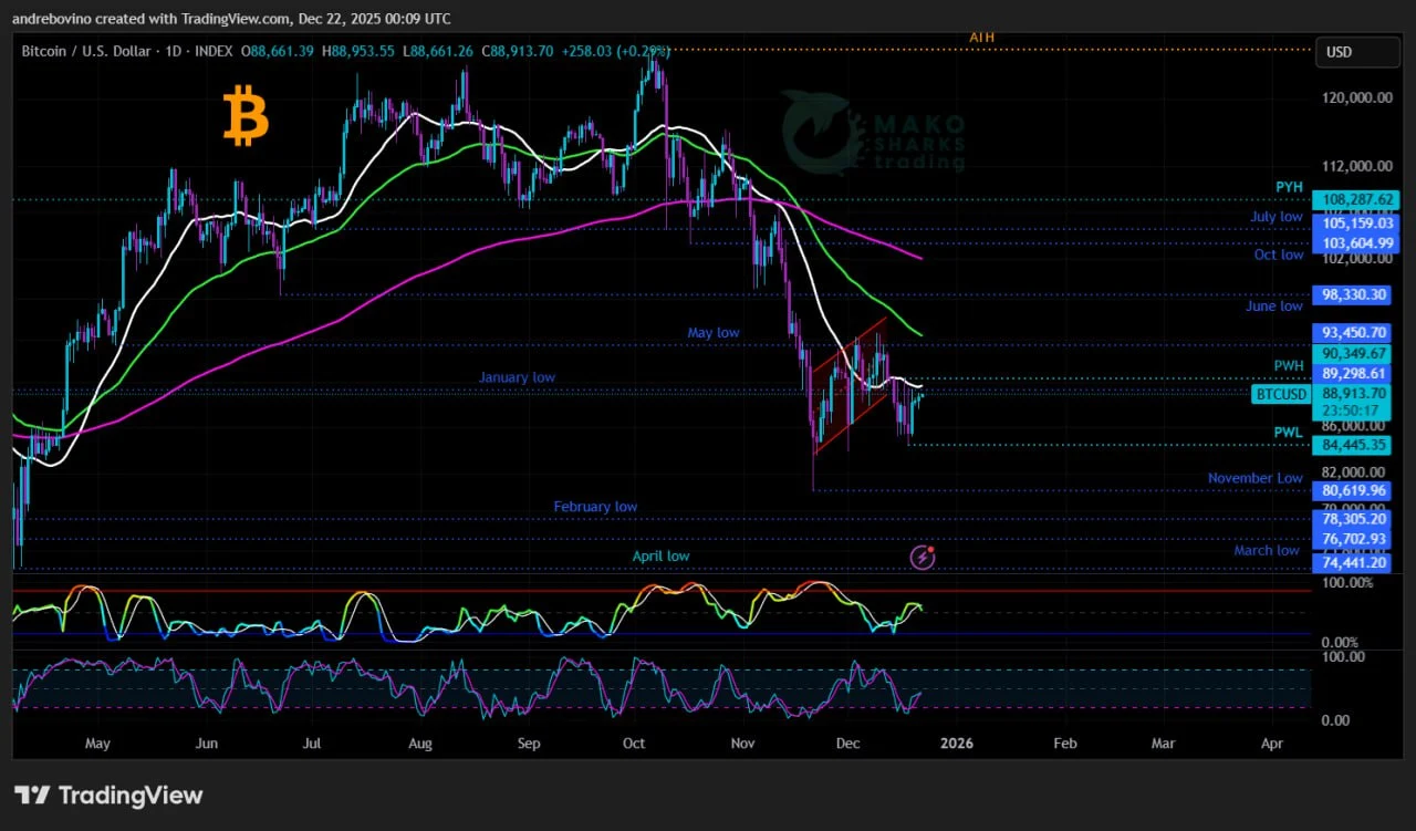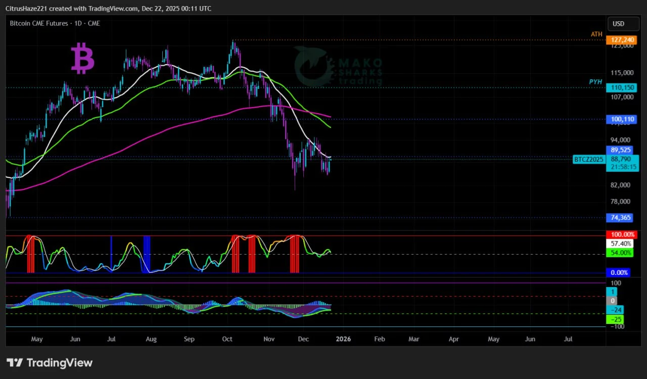Bitcoin Bulls find themselves in an unfavorable position heading into Christmas! The inability to reclaim the daily 21SMA 89.7, or the 90k zone, continues to complicate the outlook, although a spark of Hopium still flickers in hearts of many. Ideally for the Bulls, any daily close above the daily 21SMA 89.7k and the Previous Week High (PWH) at 90.3k would potentially open the path toward the daily 55EMA 94.3k and the May low at 93.4k, which currently act as the main obstacle for any further expansion toward the weekly 55EMA 97k and the June low at 98.3k, a move that could also reflect as a potential “Santa rally.”