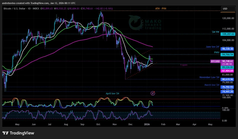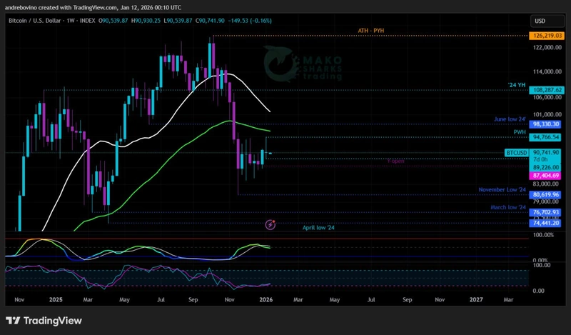 Bears remain in a significantly stronger position, with selling pressure intact as long as Bitcoin trades below the ’24 year high 108.2k and remains within the bear flag formation, which still supports the possibility of a mini rally. Ideally for Bears and the Nazgûls is to get any successful daily close below the PWL at 89.2k and the year open at 87.4k, while holding below the daily 200EMA 99.7k and the weekly 21SMA 101.8k, would reinforce downside control.