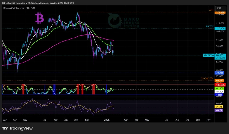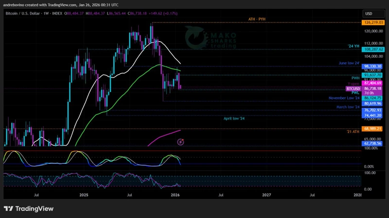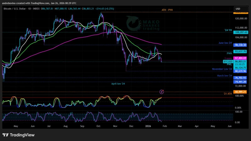 Bears are rubbing their hands as Nazgûls circle above the cryptoverse. The weekly 55EMA at 96.1k rejected Bitcoin and was confirmed as resistance, followed by trading below the monthly 21SMA at 88.9k and the year open at 87.4k, and it appears to be only a matter of time before the ’24 November low at 80.6k comes up for a test a level that currently looks like thin ice, separating Bitcoin from the mid to low 70k zone, where the next meaningful bullish reaction and bounce attempt could emerge. The mission for Bears remains unchanged: secure any successful daily close below the ’24 November low at 80.6k, which would effectively open the gates of Mordor. Ideally for Bears, staying below the year open at 87.4k and the monthly 21SMA 88.9k remains key, while holding below PWH 93.6k on a daily closing basis should be sufficient on its own. 😎 😈 😇