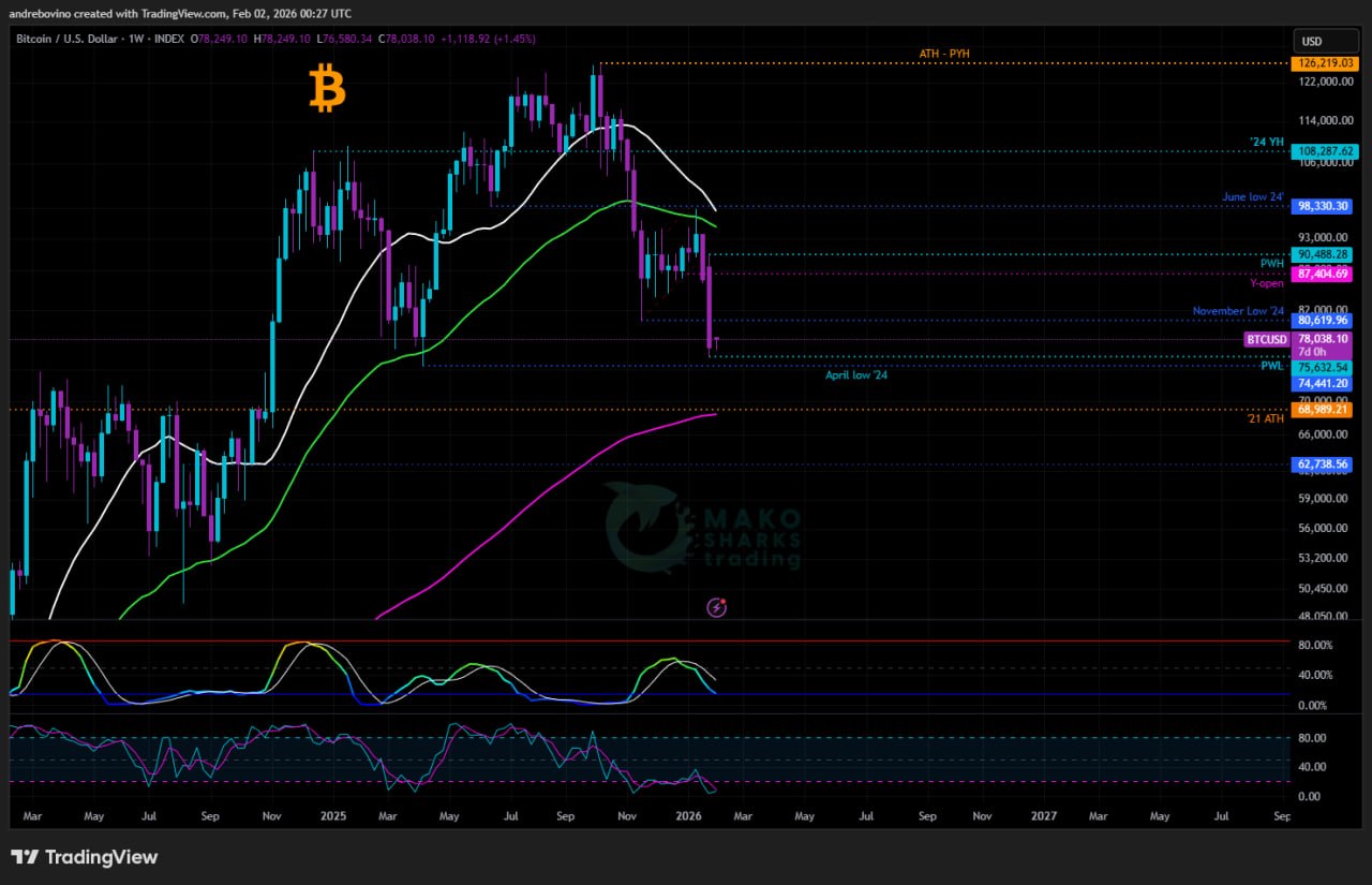 The Hopium flame is barely flickering, and Bulls are failing to find a solution even with the help of Elves and Hobbits. Crucial for Bulls is to get any successful daily close during the week above the Previous Week High (PWH) at 90.4k, monthly 21SMA 88.9k also reclaim both daily 21SMA 88.8k & 55EMA 89.8k back into support in order to even get a chance. Anything less than that is nothing more than a bear bounce and confirmation of resistance. Ideally, price would hold above the ’24 April low at 74.4k on a daily closing basis, however this currently looks less likely, and it is far more probable that we see Sell Side Liquidity (SSL) taken below 74.4k which can lead Bitcoin towards the weekly 200EMA 68.4k, which is in confluence with the ’21 ATH at 68.9k, where we could potentially expect some kind of positive reaction AKA bear bounce, that could eventually lead price back toward the year open at 87.4k before continuation. It appears that the rejection from the weekly 55EMA three weeks ago was decisive for Hopium. I will remind you of one of the previous Garfield Day analysis (29th December 2025 – bear part), where a more decent positive reaction is realistically expected in the lower 60k zone once Bitcoin completes roughly a full 50% correction. 😞 😇 😳