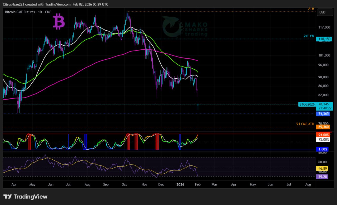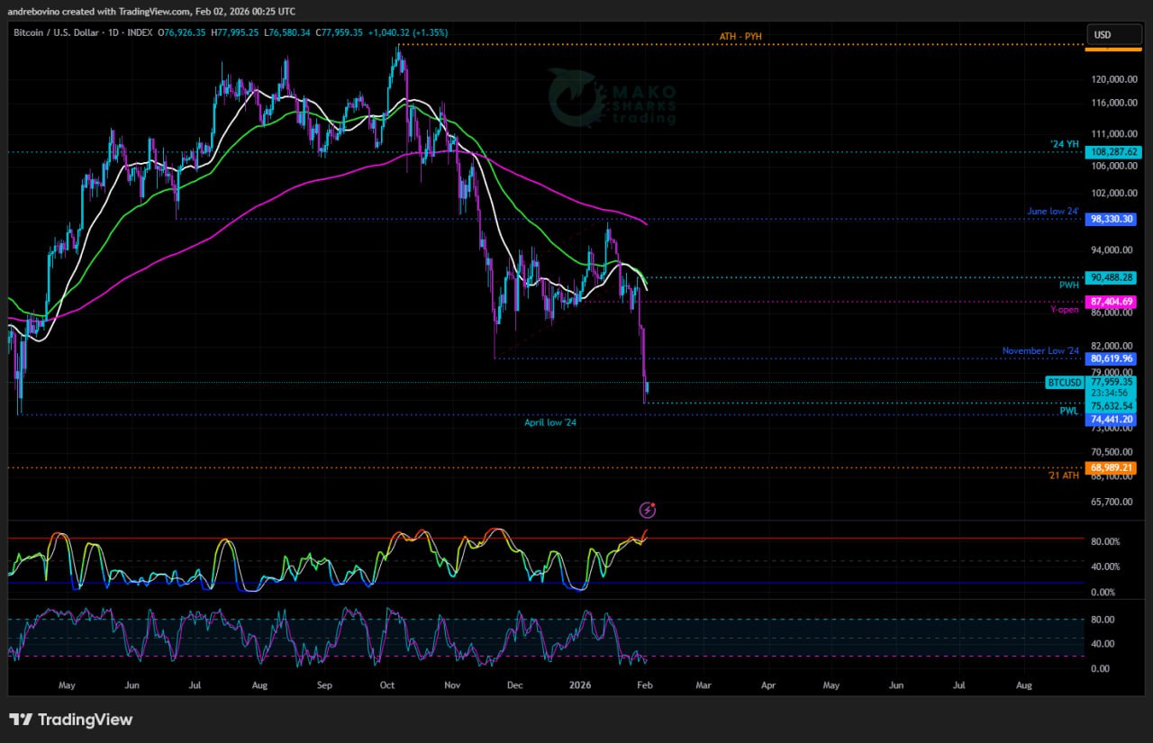 As time goes on, Bitcoin is moving “deeper and deeper into Mordor” as Bears and Nazgûls clear support after support, zone after zone. The mission “November low ’24 at 80.6k” is completed, and the new short term mission for Bears is for the April low ’24 at 74.4k to be taken out. A short consolidation with a potential minor bounce is very possible before a move lower toward the weekly 200EMA 68.4k and the '21 ATH 68.9k, which acts as a macro support that still needs to prove itself in the coming weeks. Alongside this new mission, it is ideal for Bears to remain below the monthly 21SMA 88.9k and the year open on a daily closing basis, and any successful daily close below the weekly 200EMA 68.4k would very likely push Bitcoin toward the monthly 55EMA 63.2k somewhere in the lower 60k zone. 👼 😎 😈