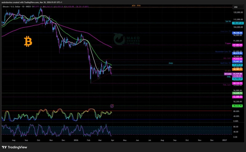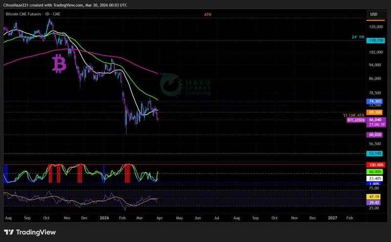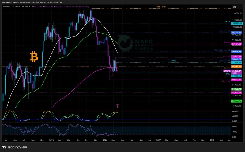 Bulls still cannot find a way to ignite Hopium into the monthly close! The only thing that can play for Bulls this week is a successful reclaim of the weekly 200EMA 68.2k and daily 21SMA at 70k & 55EMA at 71.8k. I say the only thing because the chances of defending the February low 60.1k are stillborn… A successful reclaim of the daily ‘MA lines followed by a successful daily close above Previous Week High (PWH) 71.8k can open the door potentially for a challenge of the weekly 21SMA at 79.9k but as things stand that is less likely from the current zone, but valid targets after a very likely drop into the 50k zone. 🤬 🟢⚰️