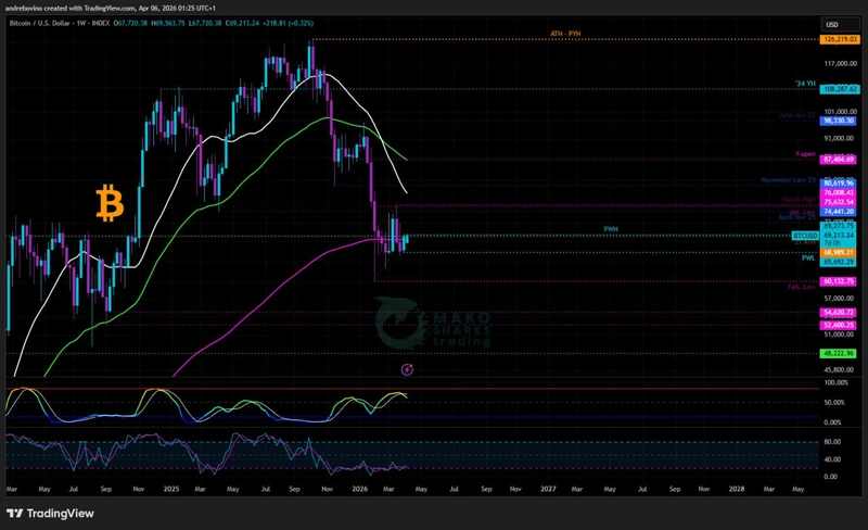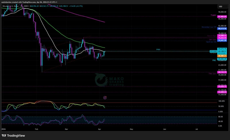 New month but same objectives! With almost no changes we enter April, BTC still on thin ice. Ideal for Bears is to keep BTC below the daily 21SMA 68.9k, 55EMA 70.9k & weekly 200EMA 68.3k on a basis of daily closes throughout the week and get a break below Previous Week Low (PWL) 65.6k which would create new trouble for Bulls and compromise the Hopium! It is crucial to get any daily close below the February low 60.1k which would push BTC into new lows. 💀 😒 😉