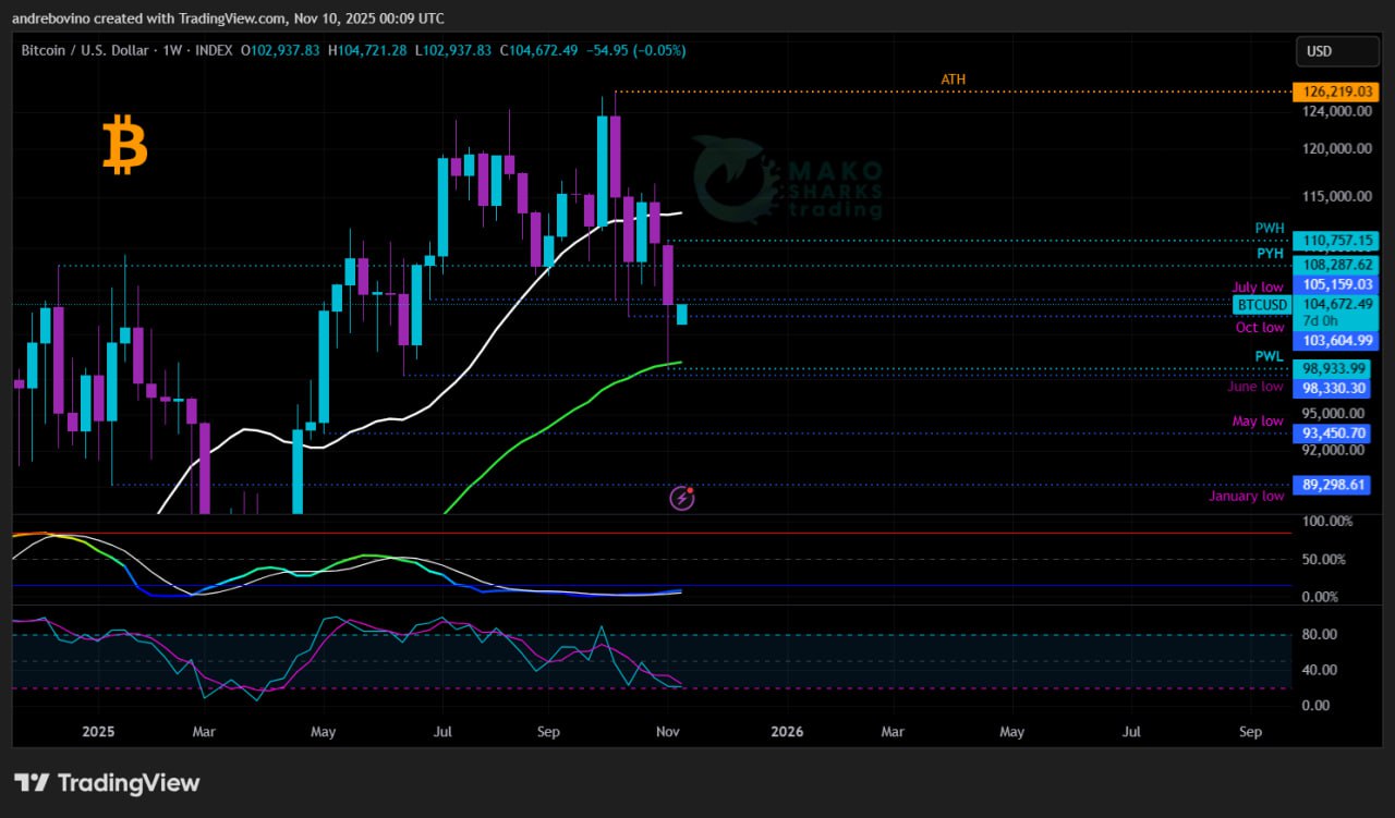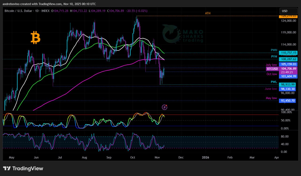Bitcoin kicks off its week at 104.7k! After three weeks of dancing around the daily 200EMA, Bitcoin now finds itself on the weekly 55EMA 99.5k. Who will this mark this “November to remember”? Will the Bulls magnificently reclaim the weekly 21SMA 113.3k and reignite Hopium once again or will the Bears showcase their cold blooded dominance? The crypto crowd remains in suspense as the line between fear and greed grows thinner than ever. 😎 ⚖️ 🦄