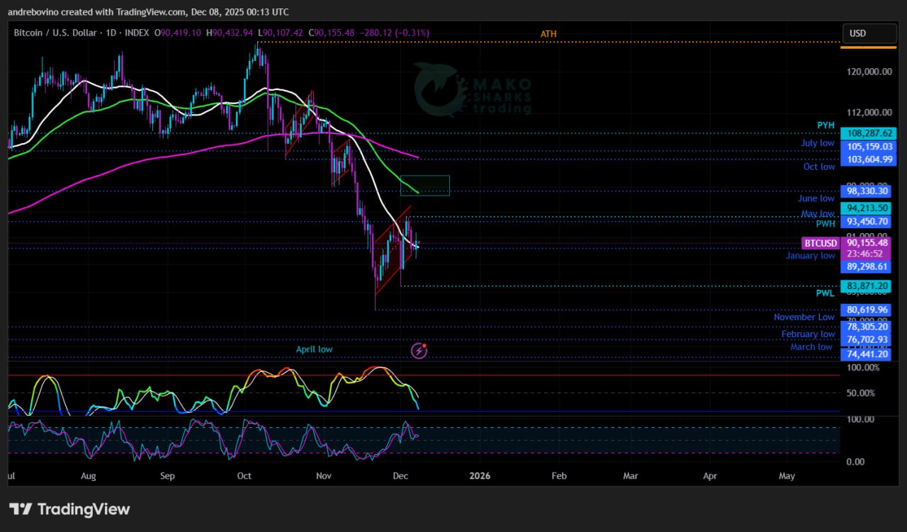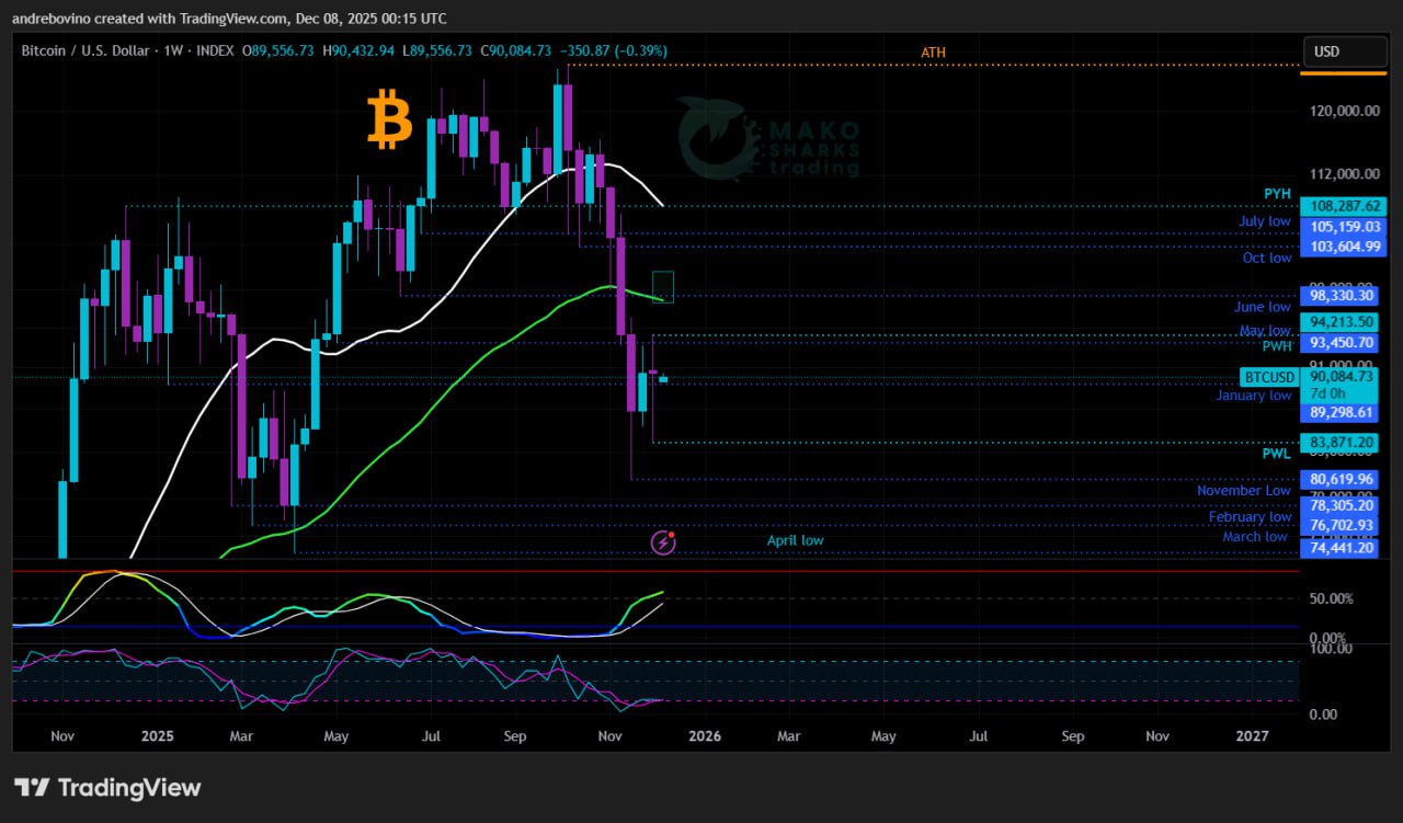Bulls are heading into another challenging week despite almost no changes compared to the previous one. The Bear flag formation is still ongoing and the same obstacles remain in place, with the daily and weekly 55EMA in confluence with the June low at 98.3k acting as the main barrier for a challenge of the Previous Year High (PYH) at 108.2k, without whose reclaim the broader trend can’t flip bullish. Ideally, Bulls and their Hopium this week need any successful daily close above the mentioned levels (98.3k), which would very likely open the path toward a PYH 108.2k challenge, but to even begin an eventual reclaim of the June low at 98.3k, Bulls need a successful daily close above the Previous Week High (PWH) at 94.2k while also maintaining support from the daily & monthly 21SMA 87.9k, as losing of them leads toward the Previous Week Low (PWL) at 83.8k and thin ice of November low 80.6k.