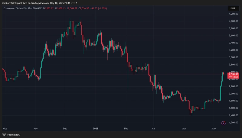At the time of writing, Ethereum is trading around $2,525, up 5.88% in the last 24 hours. However, trading volume has cooled slightly, dropping 18% to $33.79 billion. The next challenge lies at the $2,600 resistance level—a price that recently triggered a brief pullback.