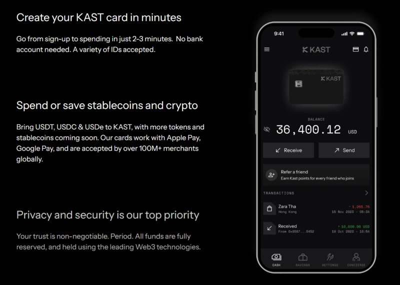 Kast employs two-factor authentication (2FA), cold storage, and regular security audits to ensure the safety of your assets.