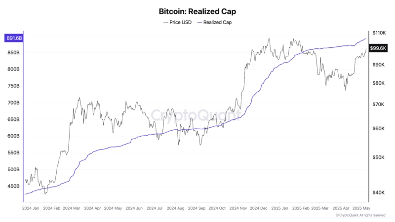 The realized cap metric offers a deeper perspective on Bitcoin’s market value by focusing on the price of coins at their last movement rather than the current market price. This approach helps illustrate how much capital is truly invested in the network. Since mid-April, Bitcoin’s realized cap has consistently set new records, reaching approximately $891 billion as of early May.