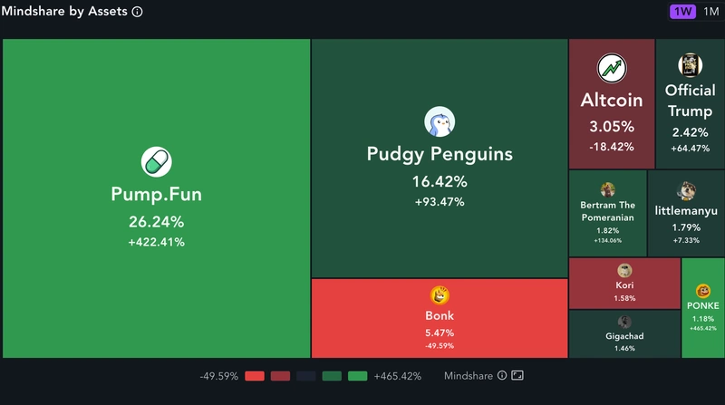 According to Messari Portals data, Pumpfun currently dominates Solana’s narrative, accounting for over 26% of the ecosystem’s mindshare by assets. It’s followed by PENGU, the Pudgy Penguins token, which has surged 93% this week and holds 16% of the mindshare.