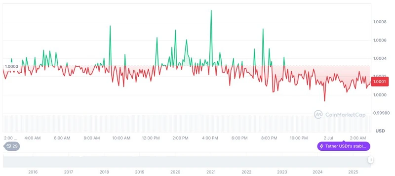 As of July 3, 2025, Tether’s USDt (USDT) maintains a steady price of $1.00, with a market cap of $158 billion and a 4.70% market dominance. USDT’s 24-hour trading volume reached $84 billion, reflecting a 40.49% increase, with 158 billion tokens in circulation.