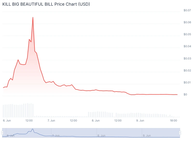 Similarly, the MELANIA token saw a 13% dip. A new memecoin called KILL BIG BEAUTIFUL BILL (KBBB) surged briefly before plummeting by over 98%.
