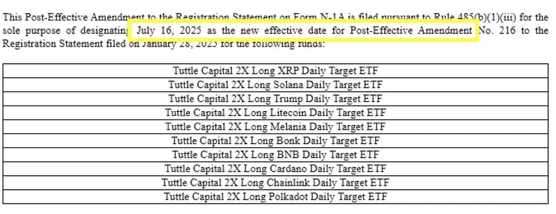The amendment applies to various 2x leveraged long crypto ETFs, including tokens like XRP, Solana, Litecoin, BNB, and Polkadot, as well as memecoins like BONK, TRUMP, and MELANIA. Although the amendment indicates a potential launch, ETF expert Eric Balchunas noted that the effective date doesn’t necessarily signal an immediate launch, but is often a precursor to such events.