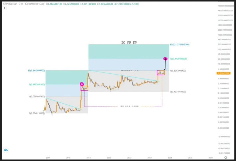 Pepa's analysis, using Fibonacci retracement levels, indicates that XRP could potentially climb to $23.94, a massive increase of about 931.9%, if it reaches the 7 Fibonacci level. This projection is supported by historical price movements, suggesting that a breakout could be imminent.